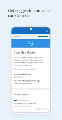 5. Get a list of the most probable conditions and associated recommendations, including: the level of urgency, medical specialization, appointment type, and related educational content.